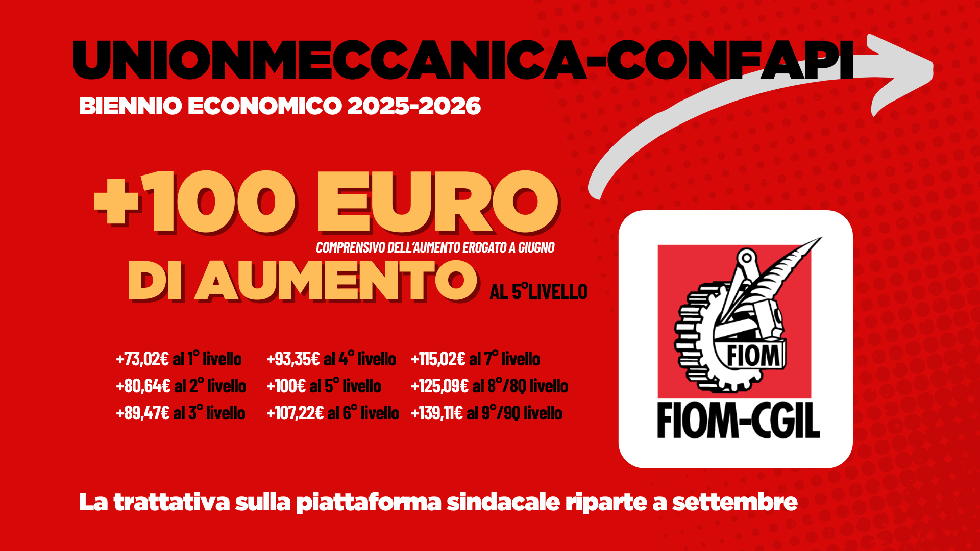 “Nella giornata di oggi, giovedì 24 luglio, è stata sottoscritta un’ipotesi di accordo tra Unionmeccanica-Confapi per il rinnovo del contratto collettivo nazionale scaduto lo scorso dicembre attraverso la definizione di un aumento dei minimi retributivi per il biennio 2025-2026. L’ipotesi prevede un aumento complessivo pari a 100 euro (rapportati al V livello) comprensivi dei 27,90 euro già erogati a giugno 2025, con le seguenti decorrenze: 22,10 euro a settembre 2025; 50 euro a giugno 2026.